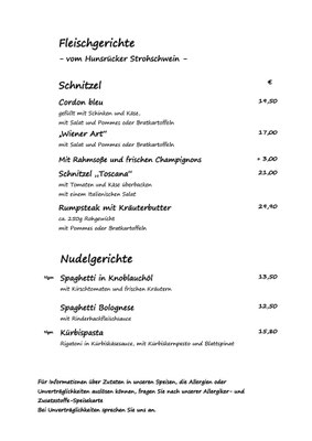 - Unsere sämtlichen Fleisch- und Wurstwaren beziehen wir von der Metzgerei Kneppel aus Morbach mit eigener Schlachtung und Schlachttieren aus der Region.